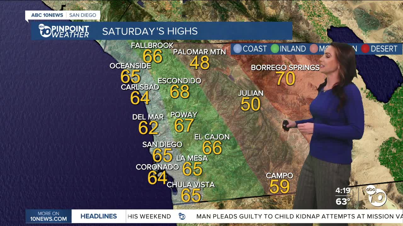 It will be cooler through Sunday with temperatures trending near to 5 degrees below average. Expect 60s for most coast and valleys, 40s and 50s in the mountains, and upper-60s to low-70s in the deserts.