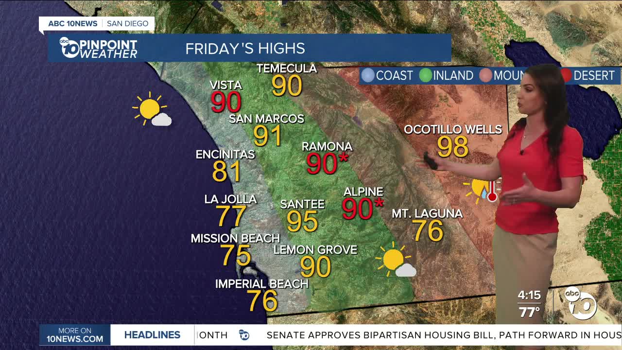 Despite the drop, temperatures will remain 10 to 15 degrees above average. Expect low to mid-70s at the coast, low to mid-80s inland, low to mid-70s in the mountains while little change is expected in the deserts staying in the mid-90s.