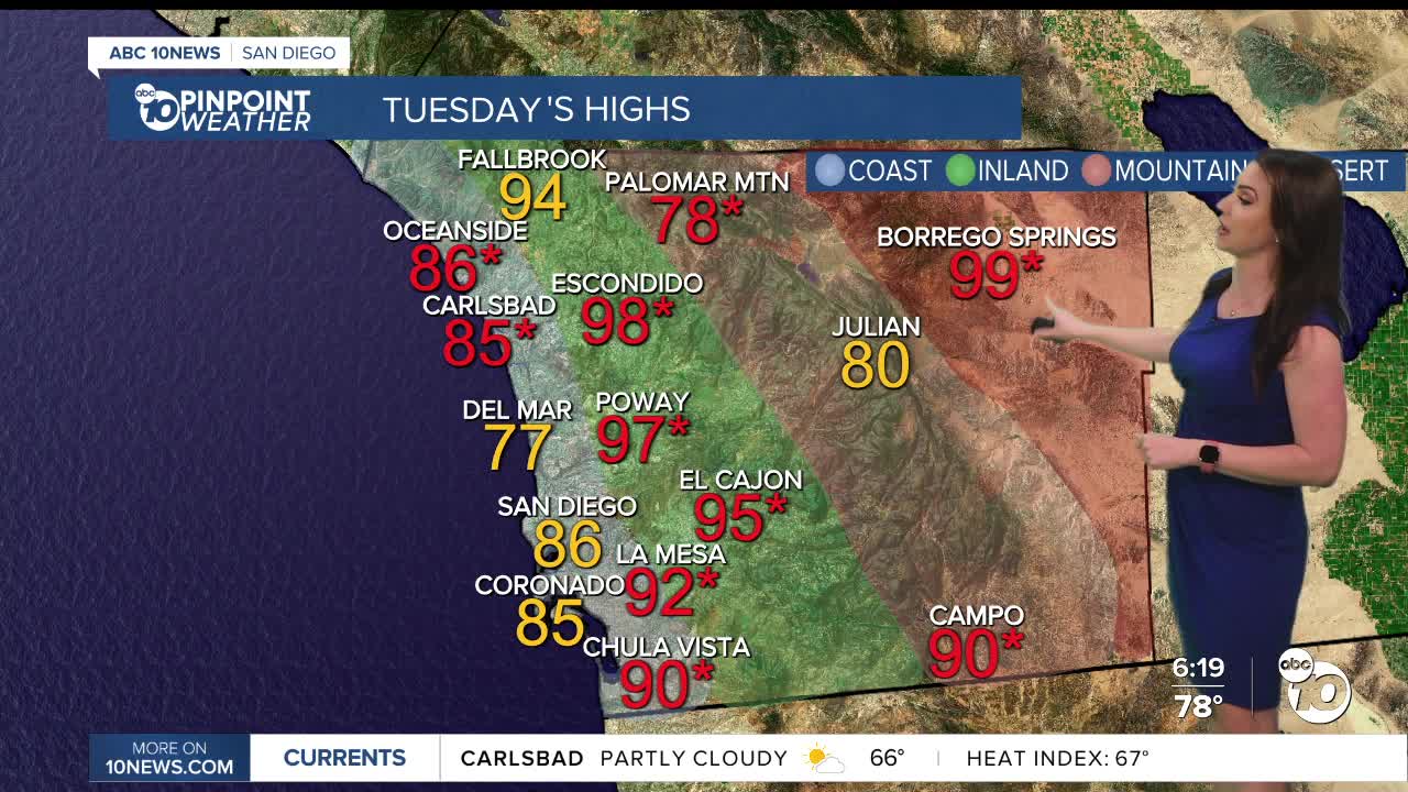Record highs were set on Monday in Ramona (89°) and Alpine (90°) while records were tied in Poway (92°) and La Mesa (88°).