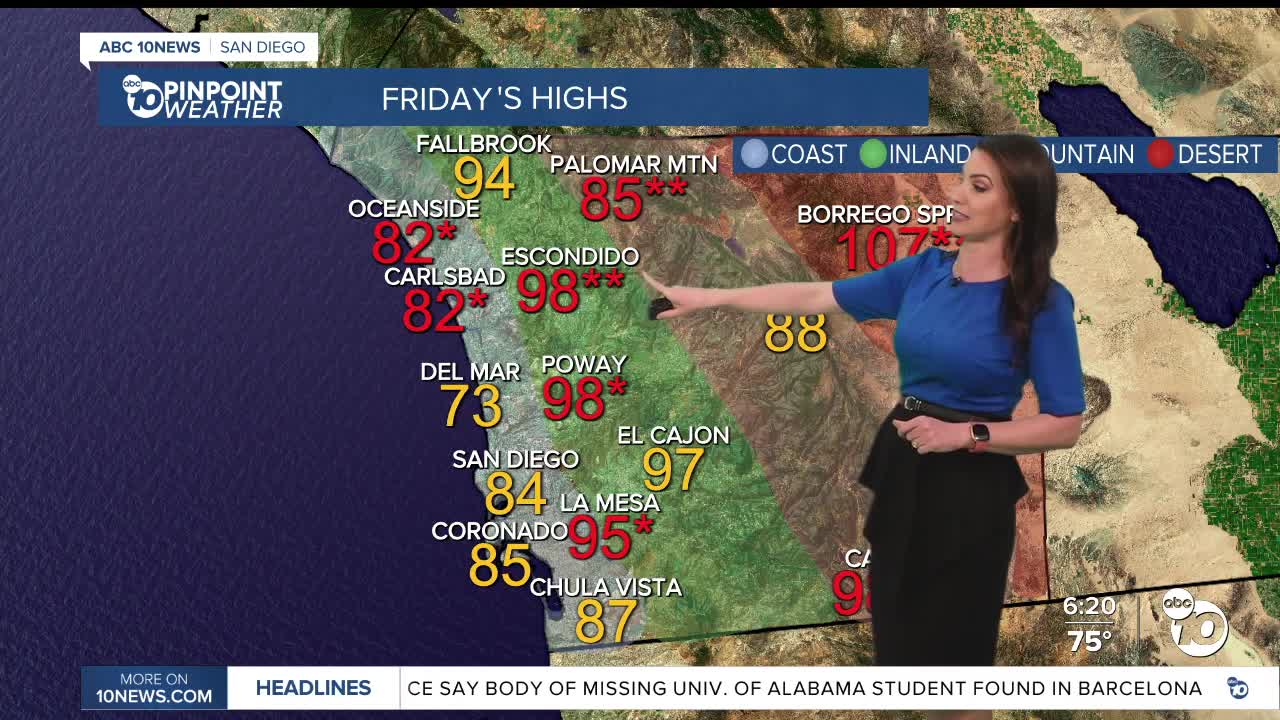 A Heat Advisory is in effect for the coast and valleys until 8pm Friday for high temperatures in the mid-80s to low-90s away from the beaches, and mostly 90s a few miles from the beaches to the inland valleys, locally up to 100 degrees.