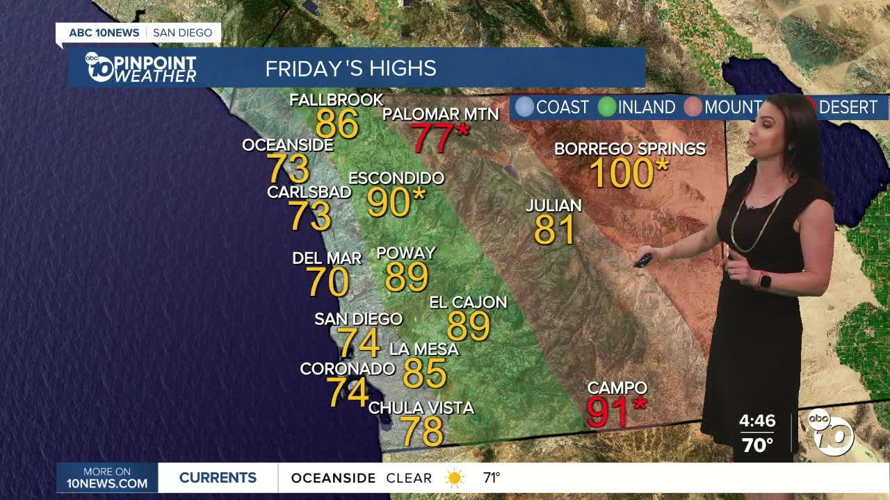 Thursday is the 12th consecutive day of record heat! Daily record highs were set in Borrego Springs (98°), Campo (91°), Lake Cuyamaca (79°) and Palomar Mountain (76°).