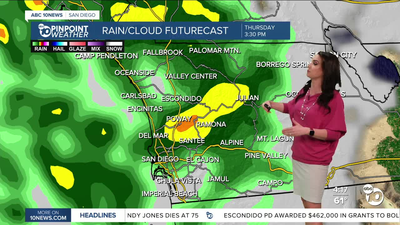 This storm, just like the last two, is going to get separated from the jet stream which makes it a bit trickier to forecast. The storm will dive south of San Diego into Friday and depending on how far away it tracks will determine how much rain we see on Friday. You can at least expected scattered showers, light to heavy, and a slight chance of thunderstorms, best chance of impactful rain on Friday will be in the mountains and deserts.