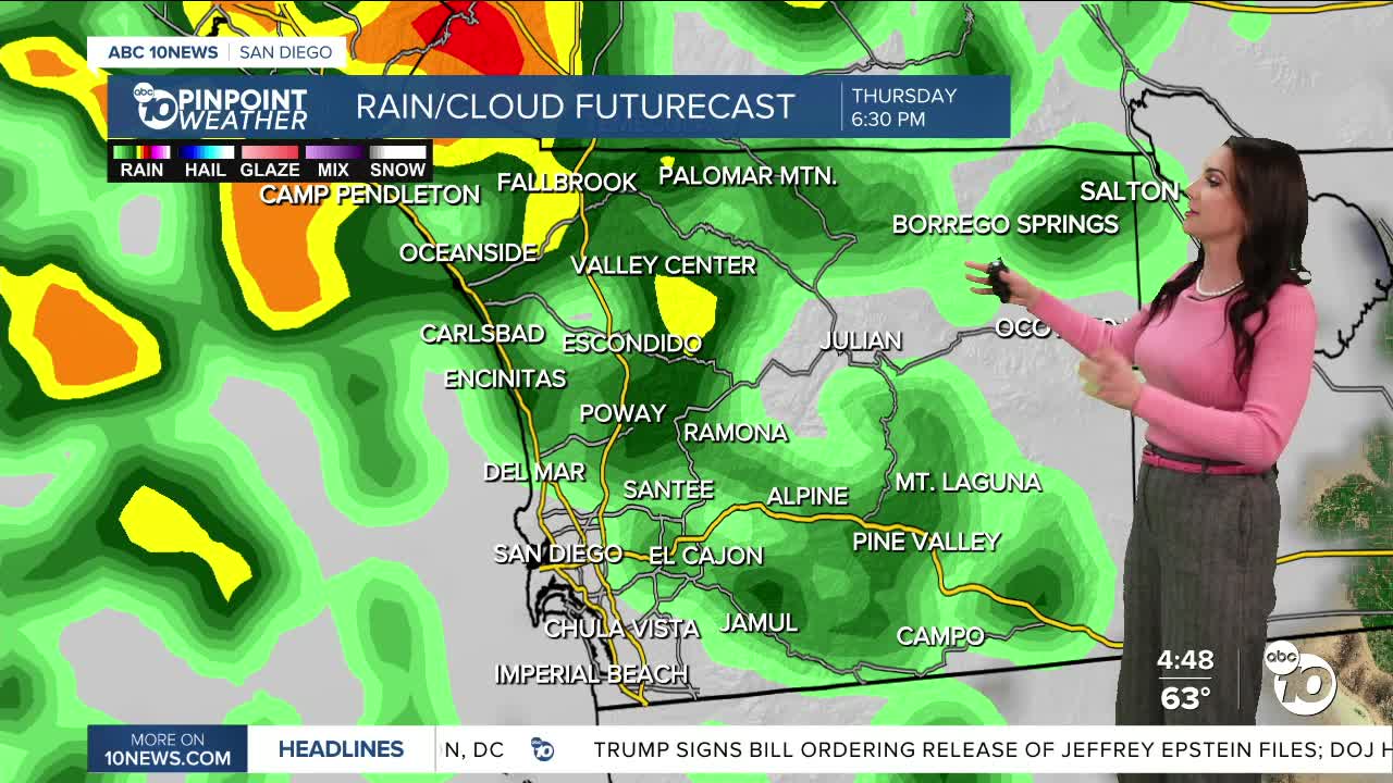 This storm, like the last two, is going to get separated from the jet stream, making it a bit trickier to forecast. The storm will dive south of San Diego on Friday, and depending on how far away it tracks, it will determine how much rain we see on Friday. You can at least expect occasional showers, light to heavy, and a slight chance of thunderstorms. The best chance of impactful rain on Friday will be in the mountains and deserts.