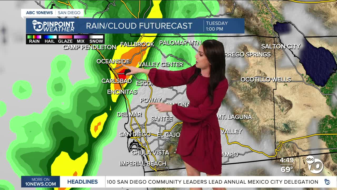 While there is a chance of drizzle or a few stray light showers overnight into Tuesday morning, the rain will become more widespread and heavier as the cold front swings through the county. Shower activity will build late morning into the afternoon, tapering off by the evening commute. Rain will build first in the north county then spread south heading into the afternoon. A few light showers may linger into early Wednesday morning.