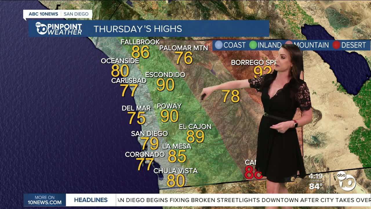 Thursday won't be a quite as hot but temperatures remain 5 to 15 degrees above normal. I'm forecasting record highs in Campo and Ramona again and getting close in Borrego Springs and Alpine.