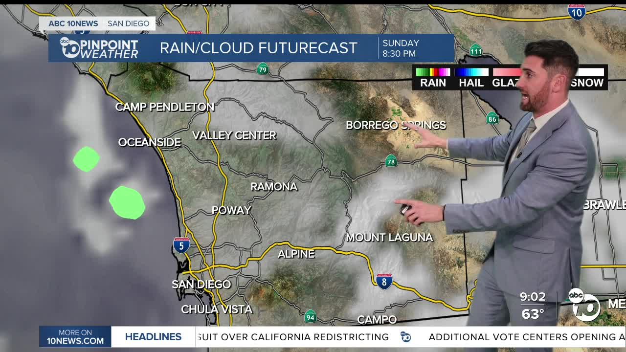 Saturday night will be clear everywhere except for the coast, which will gradually welcome more clouds and patchy fog overnight. That fog will start to roll in around 6:30 p.m., even spreading into the valleys thereafter. By 9 p.m. some spots, like Fallbrook and Vista, will be down to one mile of visibility or less.