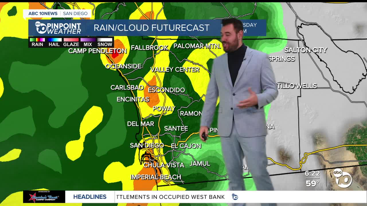 The mountain areas and parts of North County are expected to get 2-3 inches of rain by Wednesday night. The storm will move into Christmas Day, putting a damper on those holiday plans. The storm is expected to stick around until Friday. The weekend is looking much drier with partly cloudy skies.