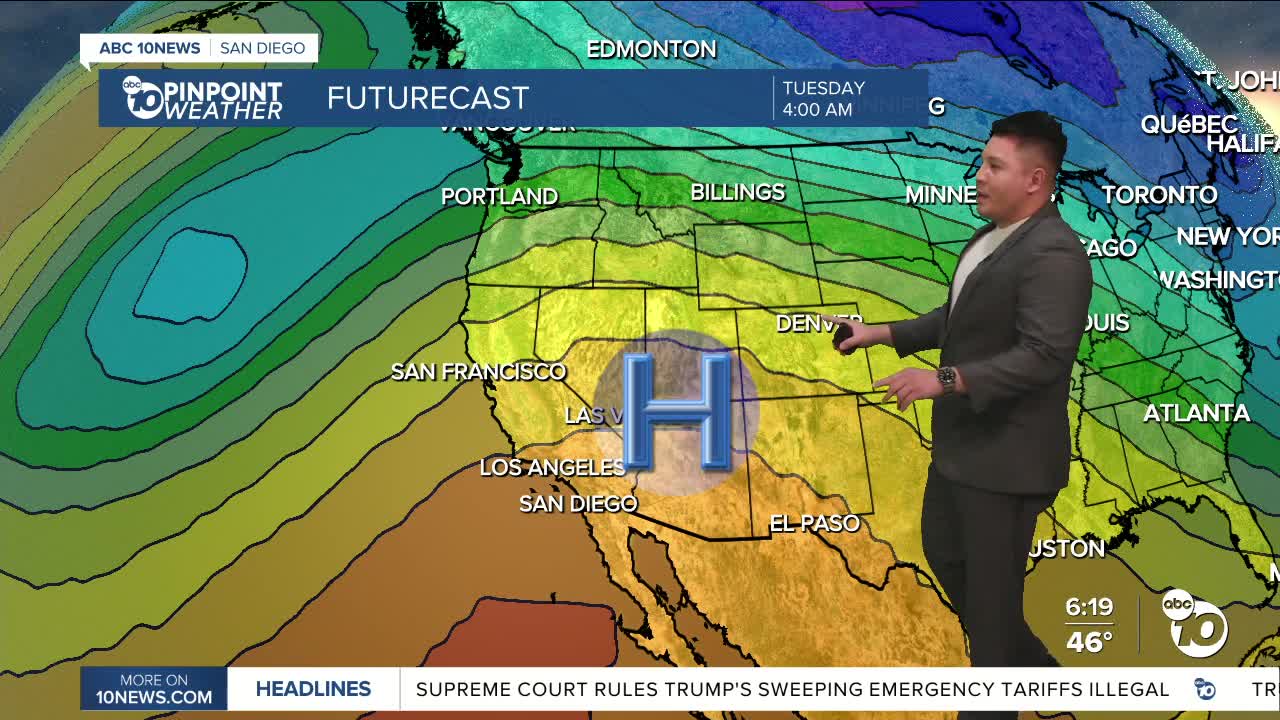 SAN DIEGO (KGTV) — Gradual warming and dry weather through the end of the week with highs increasing to as much as 10 to 20 degrees above normal. High clouds and weak offshore flow expected through Tuesday, then weak onshore flow returns with increasing chances for marine low clouds later in the week.