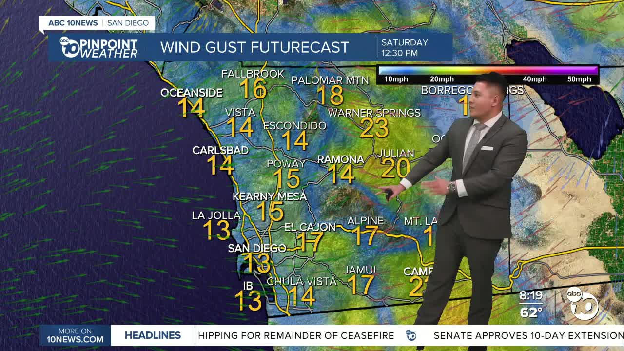 By the end of the week, the broader weather pattern keeps cooler-than-average temperatures in place along with continued afternoon breezes in the mountains and deserts. The marine layer will deepen during this time, although cloud coverage may become more limited and patchy after the main system moves through. Overall, the forecast sets up a warm and comfortable weekend before a return to cooler, breezy spring conditions next week.