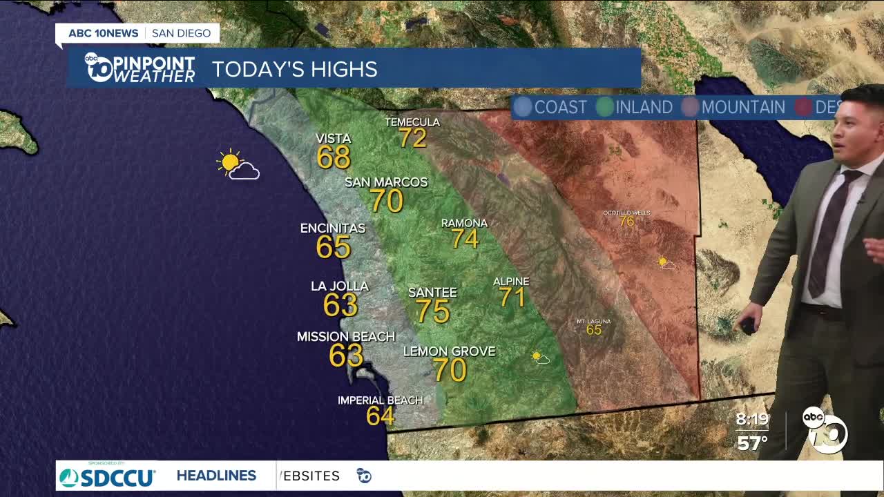 A persistent marine layer with night and morning low clouds and fog for the coastal areas and western valleys will help moderate high temperatures in those areas, while inland areas remain warm. Highs along the coast will be near normal, around 5 to 10 degrees above normal for the valleys and low deserts, and as much as 15 degrees above normal for the lower elevation mountains and high deserts.