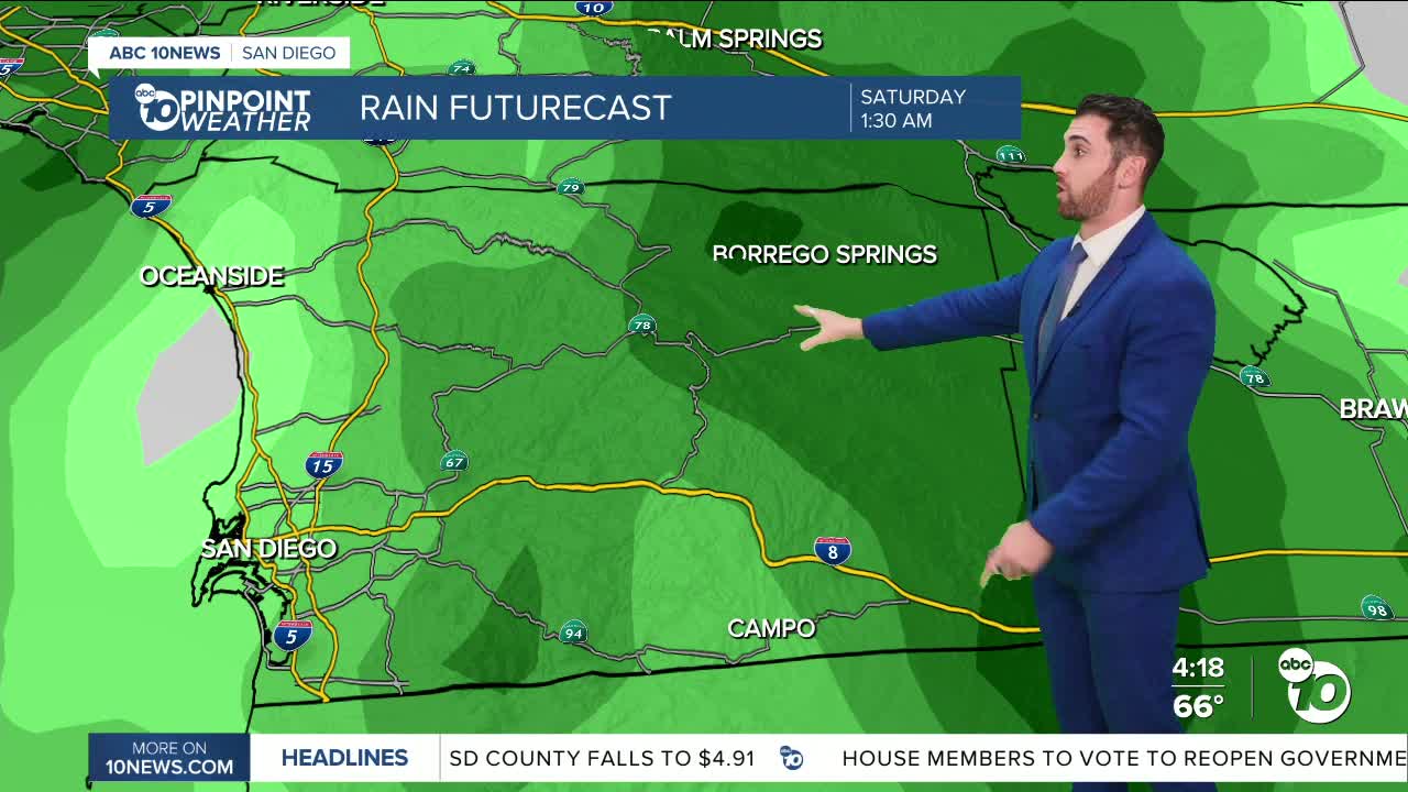 Totals from start to finish for this system could be between 2-3" in and west of the mountains, with the highest amounts coming to Oceanside. Meantime, the deserts could finish with around 1" of rain.